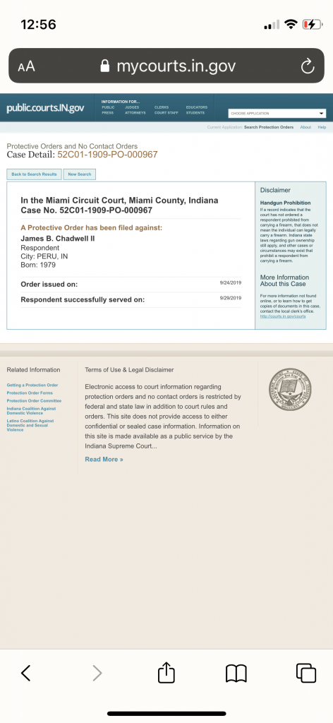 POR - Service Perfected: Service Date: 4/26/2021 4:00 PM Person Served: James Brian Chadwell II;Served By: Sarah Wyatt; Street: 301 Main Street; City: Lafayette; County: Tippecanoe; Agency: Tippecanoe Superior Court 2; Manner: Court;