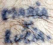 - 12" surgical scar on the mid line of the abdomen and originating below naval.