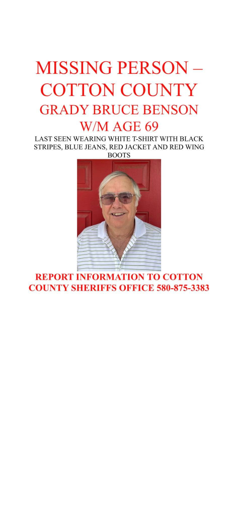 If anyone has any information on Benson's disappearance or knows of his whereabouts, they are asked to call the Cotton County Sheriff's Office at (580) 875-3383.