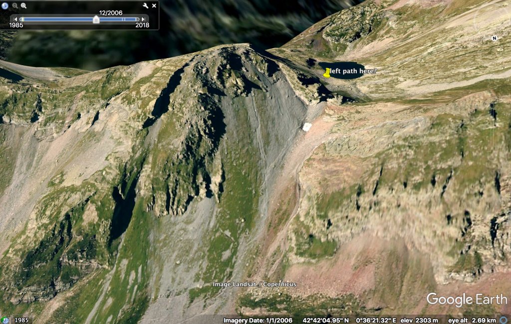 I found the shadows hadn't been added into earlier imagery on Google Earth, so you can view the face back in time. For example, here from 2006 with the yellow pin behind, showing the point that people have been suggesting she may have left the path to access the Pic from. The face might be a bit different now though of course!