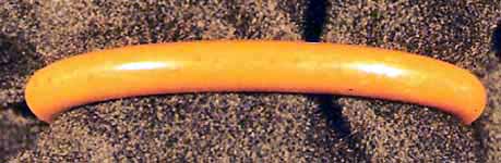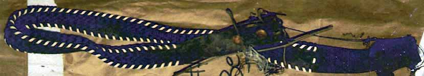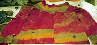 Clothing: Red pullover turtle neck sweater with yellow and beige stripes at waist, neck, and cuffs; 18” zipper. Two pieces of leather 16”x4”. Brown leather belt with white plastic stitching at both edges, 30” long, from buckle to tip.