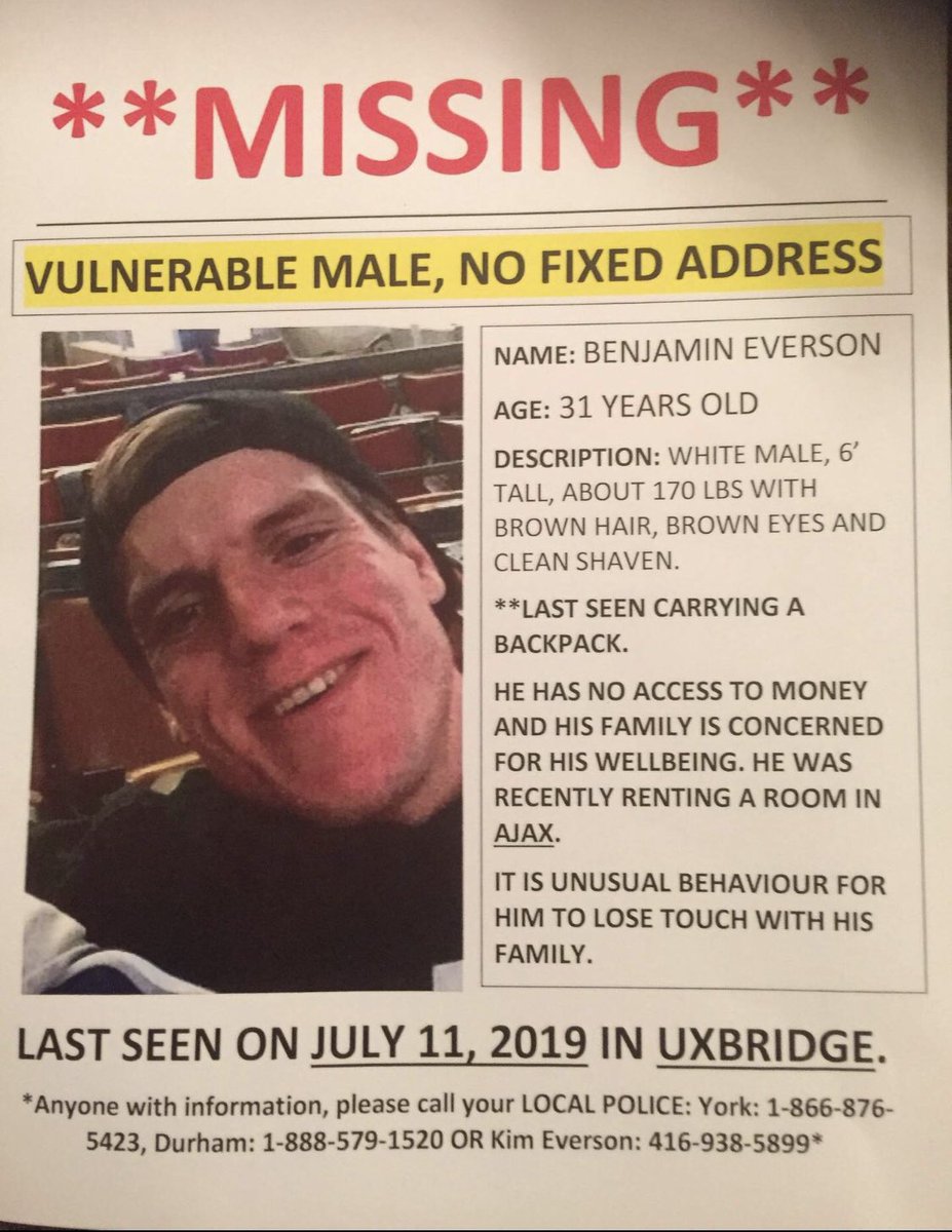 The owner of the Stouffville Florist shop for the last 35 years said her 31-year-old son Benjamin Everson went missing July 11. She said her son had been troubled for many years but still would contact her on a daily basis, sometimes multiple times a day. The 31-year-old, who is described as vulnerable, has no access to money.